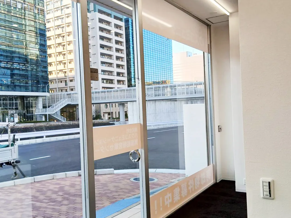 ↓ 正面ガラスサイン設置後の外側から